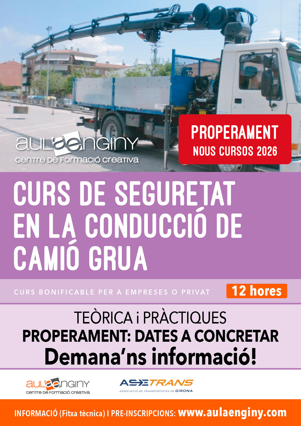 Properament: Curs de SEGURETAT EN LA CONDUCCIÓ DE CAMIÓ GRUA POTS FER LA TEVA INSCRIPCIÓ EN AQUEST >> FORMULARI INDICANT EL NOM DEL CURS CURS DE SEGURETAT EN LA CONDUCCIÓ DE CAMIÓ GRUA CURS BONIFICABLE PER A EMPRESES O PRIVAT (10 hores) PROPERAMENT: DATES A CONCRETAR DEMANA’NS INFORMACIÓ!!! TEMARI